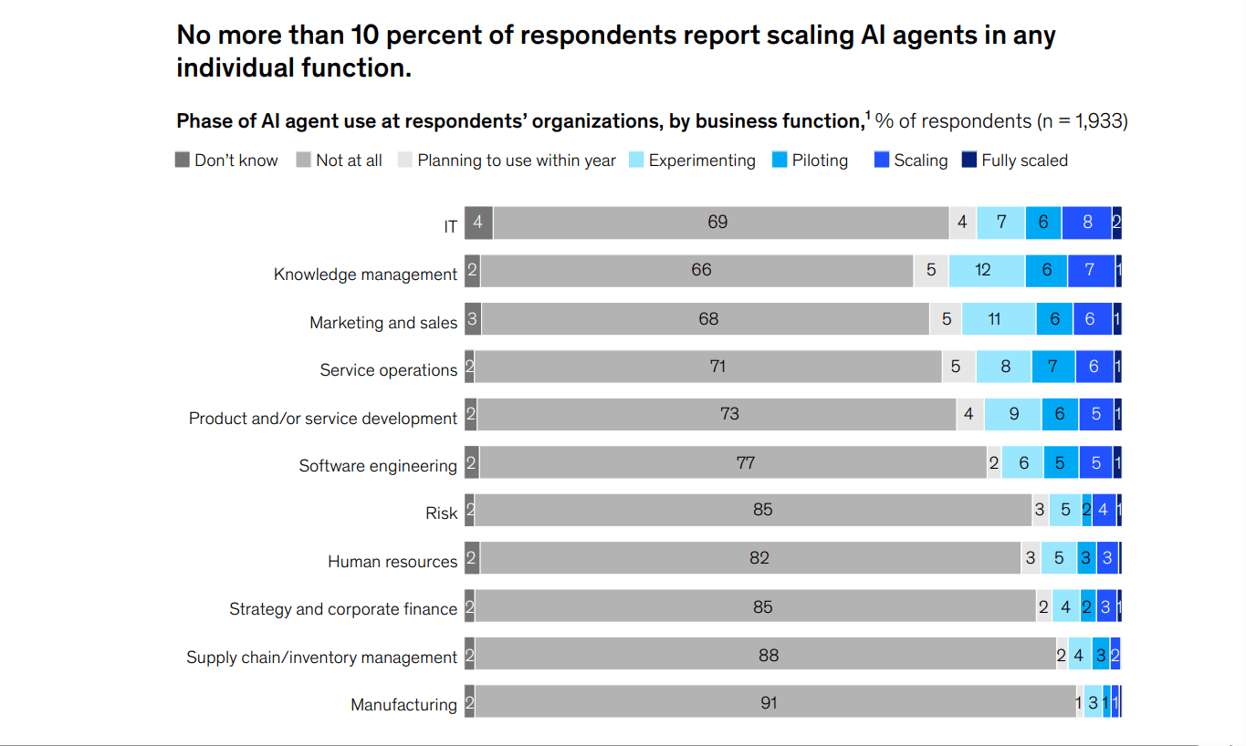 L’engouement pour les agents IA est notable : 72 % des organisations expérimentent au moins ces nouveaux outils. Cependant, l'utilisation généralisée des agents n'est pas encore une réalité : seules 23 % des entreprises mettent en place un système d'agents dans une partie de l'entreprise, et la plupart le font dans une ou deux fonctions seulement.