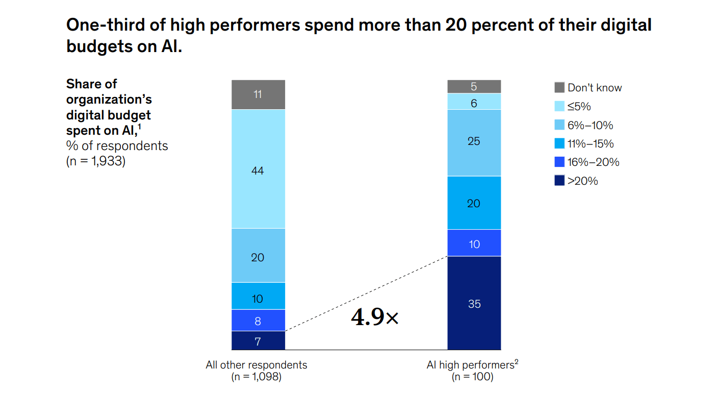 Ces leaders de l’innovation investissent en moyenne beaucoup plus : plus d’un tiers des très performant alloue plus de 20 % de son budget numérique aux technologies d’IA, un taux environ 5 fois plus élevé que les autres. De plus, ils sont beaucoup plus susceptibles de voir leurs initiatives en matière d’IA soutenues par des dirigeants solides qui font preuve d’engagement, de pipeline et de stratégie.