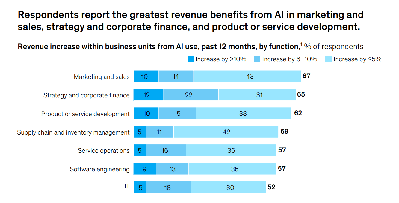 Les avantages en matière de réduction des coûts « sont plus courants dans l’ingénierie logicielle, la fabrication et l’informatique », selon l’analyse 2025. « En ce qui concerne la croissance des revenus, les fonctions qui en tirent les plus grands bénéfices sont le marketing et les ventes, la stratégie et les finances de l'entreprise, ainsi que le développement de produits et de services. »