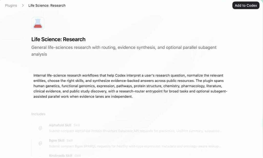 Un élément central du projet est le plugin des sciences de la vie développé pour le Codex. Le package vous permet de connecter le modèle à plus de 50 bases de données et outils scientifiques publics.