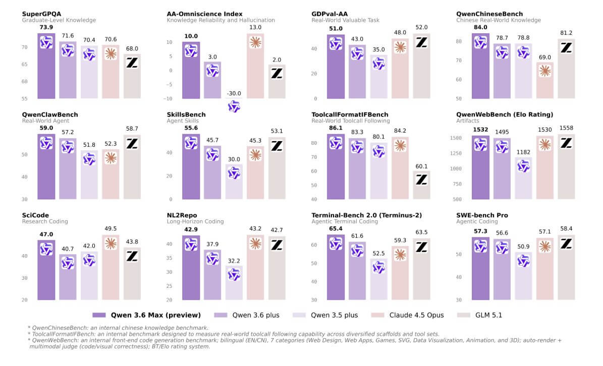 Alibaba décrit Qwen3.6-Max-Preview comme un accès anticipé de la prochaine génération phare. Par rapport à Qwen3.6-Plus, lancé fin mars, les améliorations mesurables se concentrent sur six benchmarks de programmation, pour lesquels Max-Preview revendique la première place au moment de sa sortie : SWE-bench Pro, Terminal-Bench 2.0, SkillsBench, QwenClawBench, QwenWebBench et SciCode.