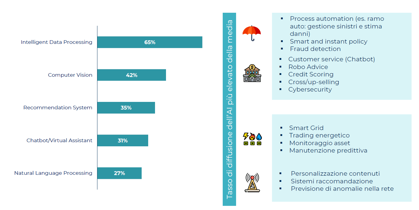 Selon ce qu’a rapporté l’Observatoire de l’Intelligence Artificielle de l’École de Gestion de l’Université Polytechnique de Milan, en 2022, la part la plus importante du marché italien de l’IA (65%) est liée aux solutions d’analyse et d’extraction d’informations à partir de données (Traitement intelligent des données), en particulier pour faire des prévisions dans des domaines tels que la planification commerciale, la gestion des investissements, les activités budgétaires, la maintenance prédictive et la sécurité de l’information.