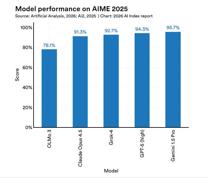 Un signal à contre-tendance vient du côté de l’efficacité. OLMo 3.1 Think 32B, publié par l’Allen Institute for AI, possède environ 32 milliards de paramètres, soit près de 90 fois moins que le billion déclaré de Grok 4. Pourtant, sur plusieurs tests de référence, les deux obtiennent des résultats comparables. L’Indice attribue la performance aux techniques taillela déduplication et la conservation des données, plutôt qu’à l’échelle brute.