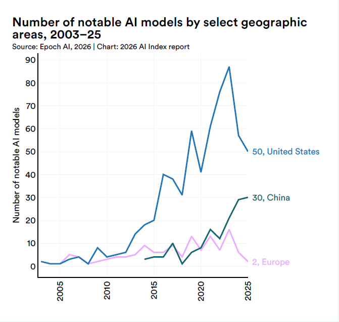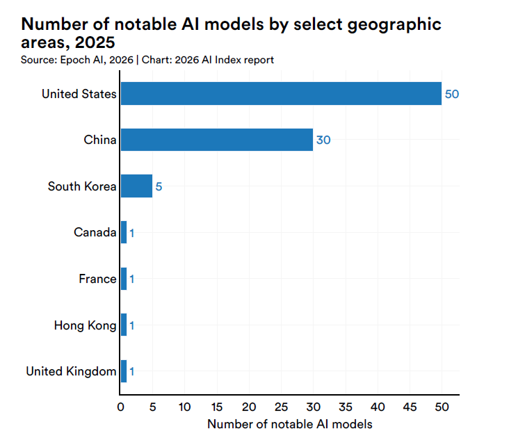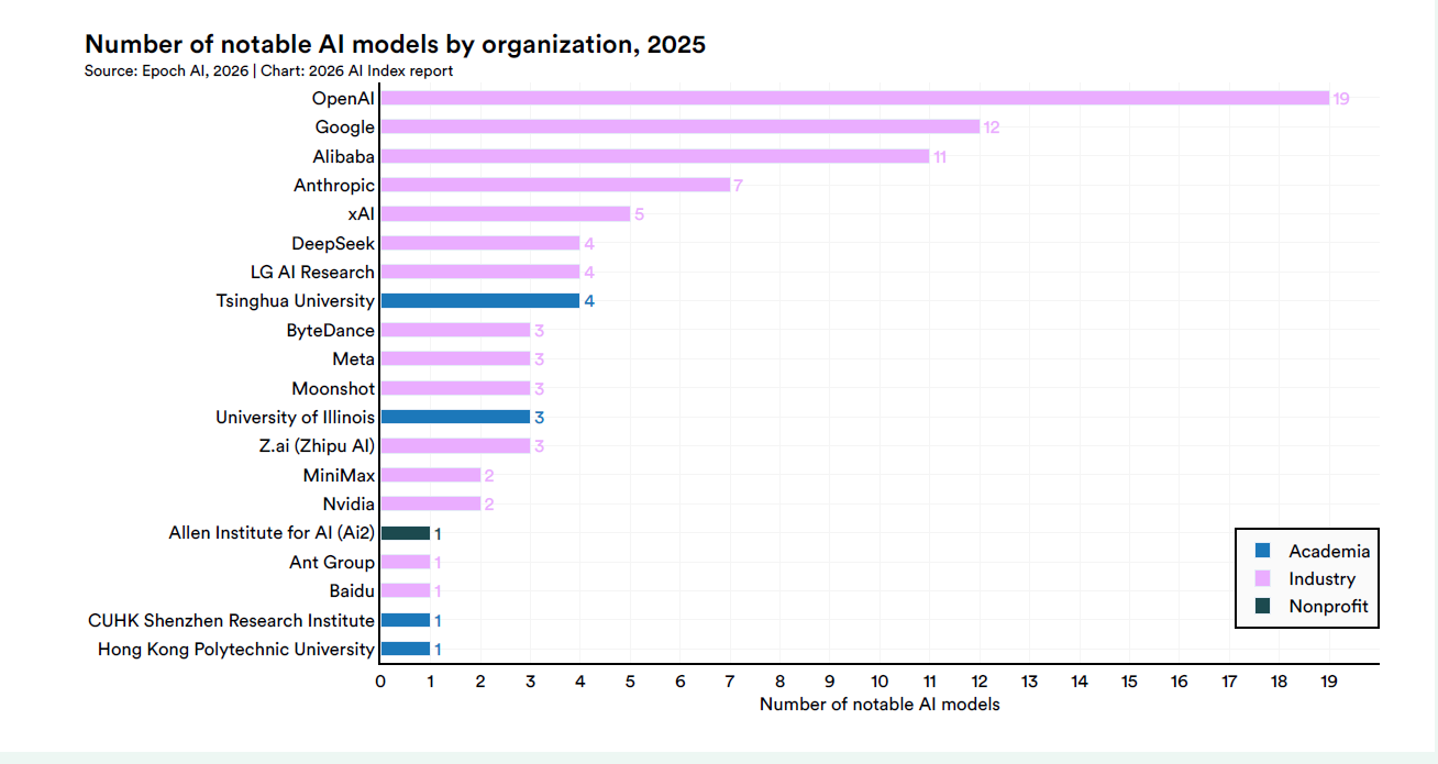 L’AI Index 2026 de Stanford, qui photographie les chiffres de la recherche et du développement, dessine un écosystème qui grandit et rétrécit en même temps. En 2025, 95 modèles « remarquables » ont été commercialisés, dont 87 conçus par l’industrie privée, et 1 seulement par des laboratoires académiques.