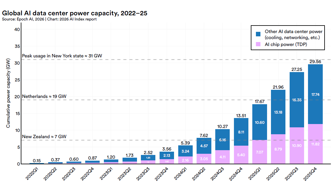 La capacité électrique des centres de données IA a atteint 29,6 GW au quatrième trimestre 2025, comparable à la consommation de l’État de New York aux heures de pointe et supérieure aux besoins des Pays-Bas.
