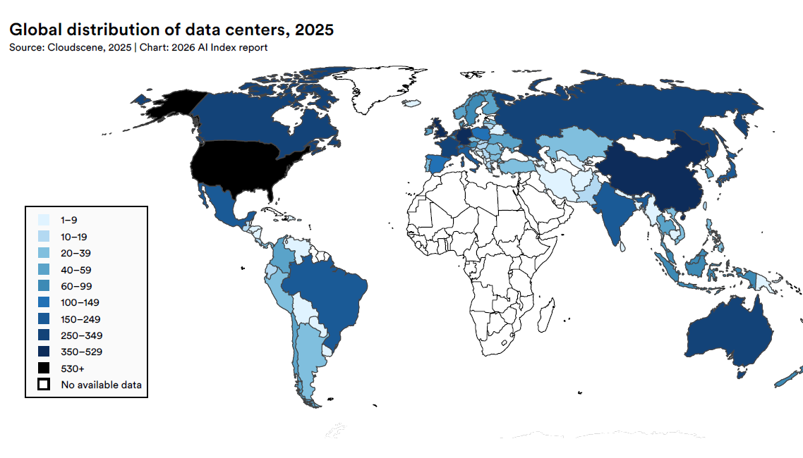 Même si les modèles et les critères de référence ont été discutés, l’infrastructure physique qui les soutient a pris des dimensions comparables à celles des systèmes étatiques. Les États-Unis abritent 5 427 centres de données, soit plus de dix fois n’importe quel autre pays au monde.